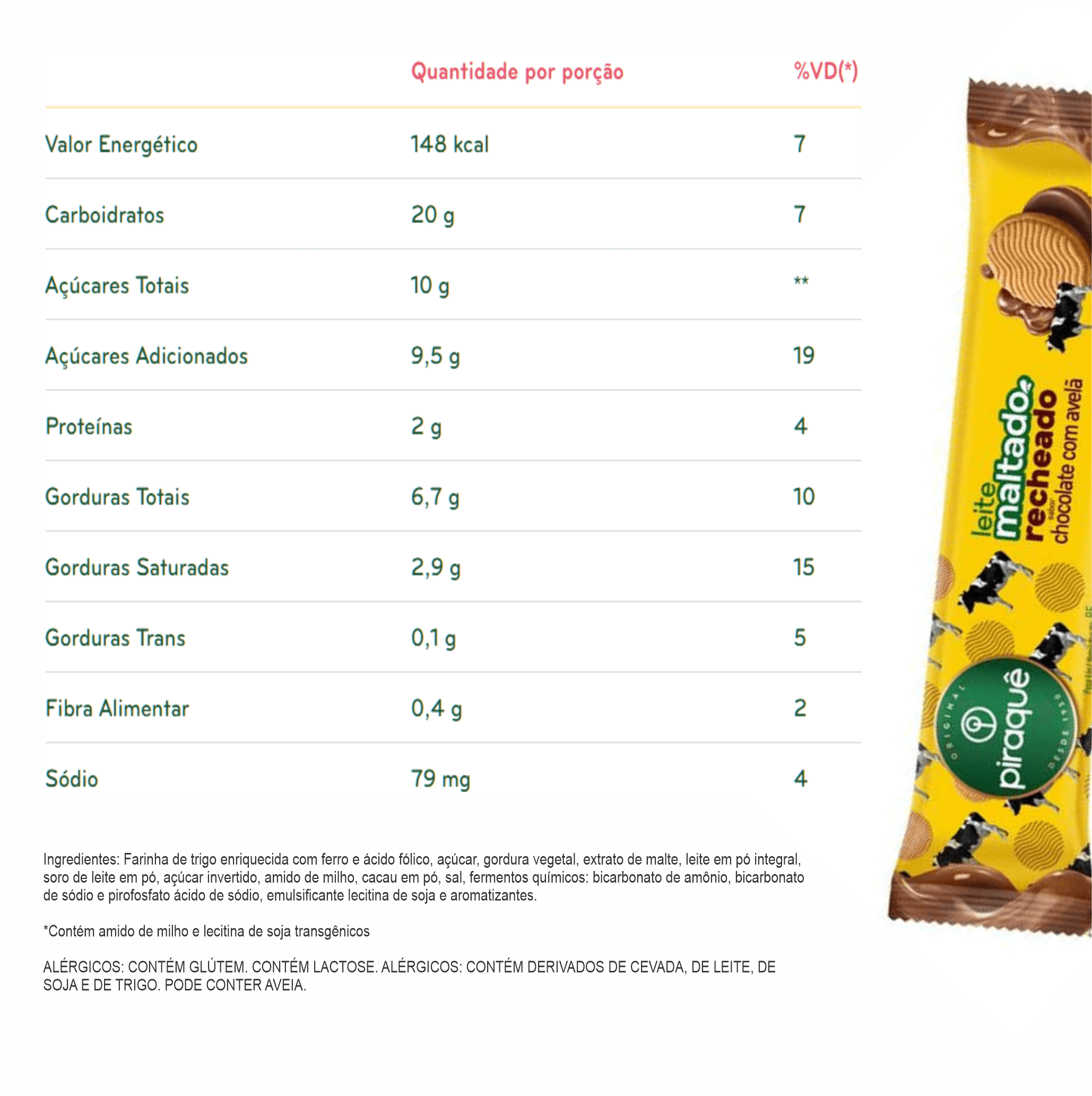 BISCOITO PIRAQUÊ MALTADO RECHEADO CHOCOLATE C/ AVELÃ 85g