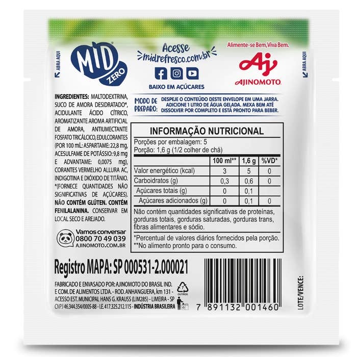 MID ZERO REFRESCO EM PÓ AMORA 8g